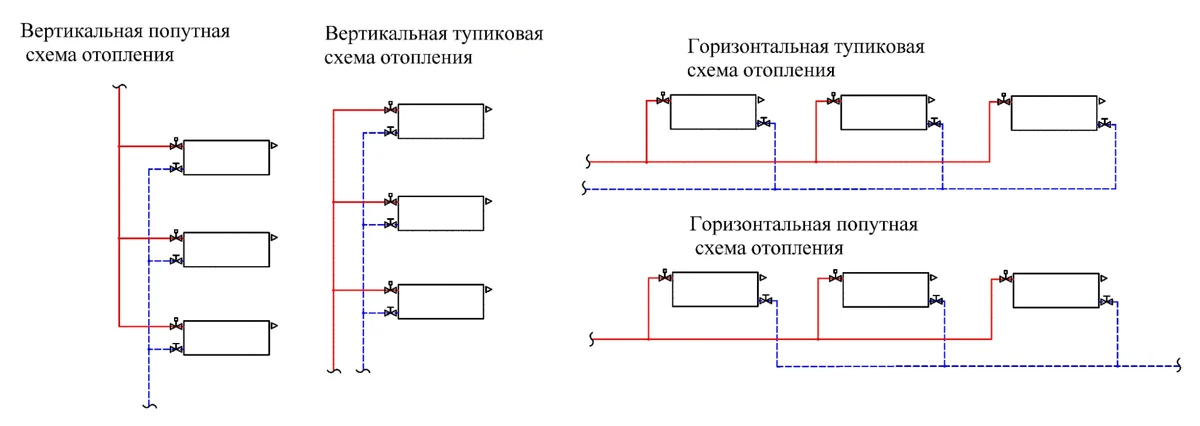 - Существует несколько популярных схем — тупиковая, попутная, коллекторная. В многоэтажных зданиях также используются вертикальная, горизонтальная, верхняя и нижняя разводки. Выбор зависит от планировки дома.