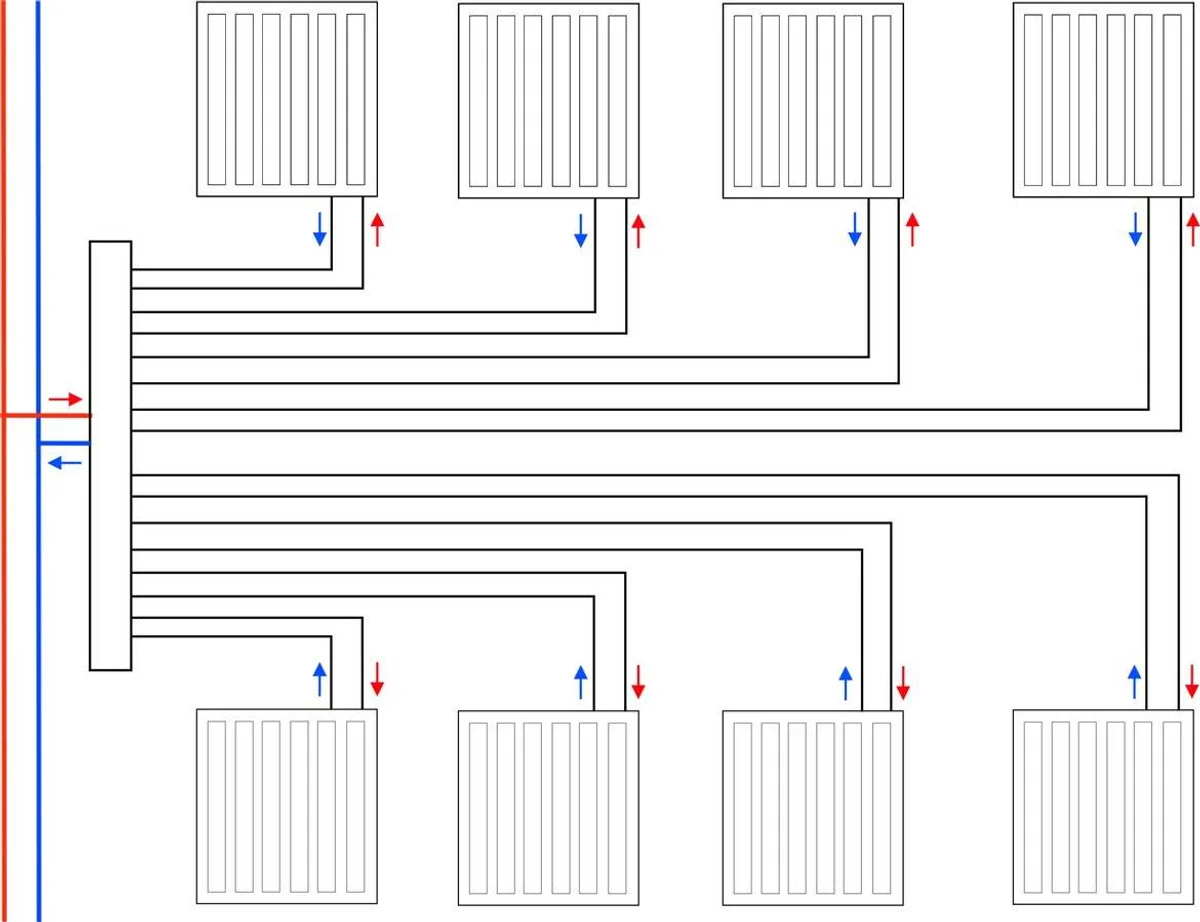 Каждая батарея подключается к центральному коллектору подачей и обраткой. Это максимально гибкий вариант: можно регулировать, отключать и обслуживать батареи независимо. Каждый из них фактически превращается в отдельный отопительный контур.