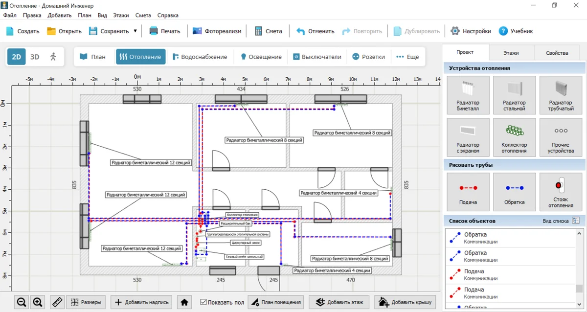 В программе есть готовый каталог оборудования. Помимо схемы отопления тут можно составить план электрики, канализации и водоснабжения. Благодаря этому вы гарантированно избежите пересечения коммуникаций между собой.