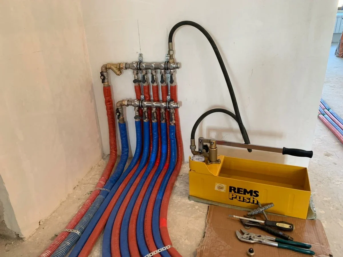 Перед заливкой стяжки или закрытием стен проведите опрессовку. Заполните трубы водой или воздухом, создайте давление в 2,5–3 бара. Выдержите это значение не менее 30 минут, а лучше — 2–4 часа. Убедитесь, что манометр не фиксирует падения. Только после подтверждения герметичности можно заливать стяжку или заделывать штробы.