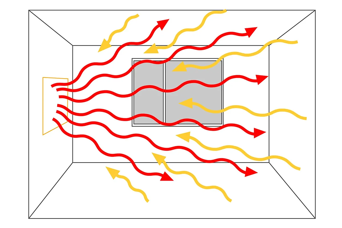 Инфракрасный обогрев работает примерно так же, как и солнечный свет. Панели излучают длинноволновые ИК-лучи, которые в первую очередь нагревает не воздух, а поверхности — пол, стены, мебель. Предметы интерьера передают энергию всему остальному помещению.