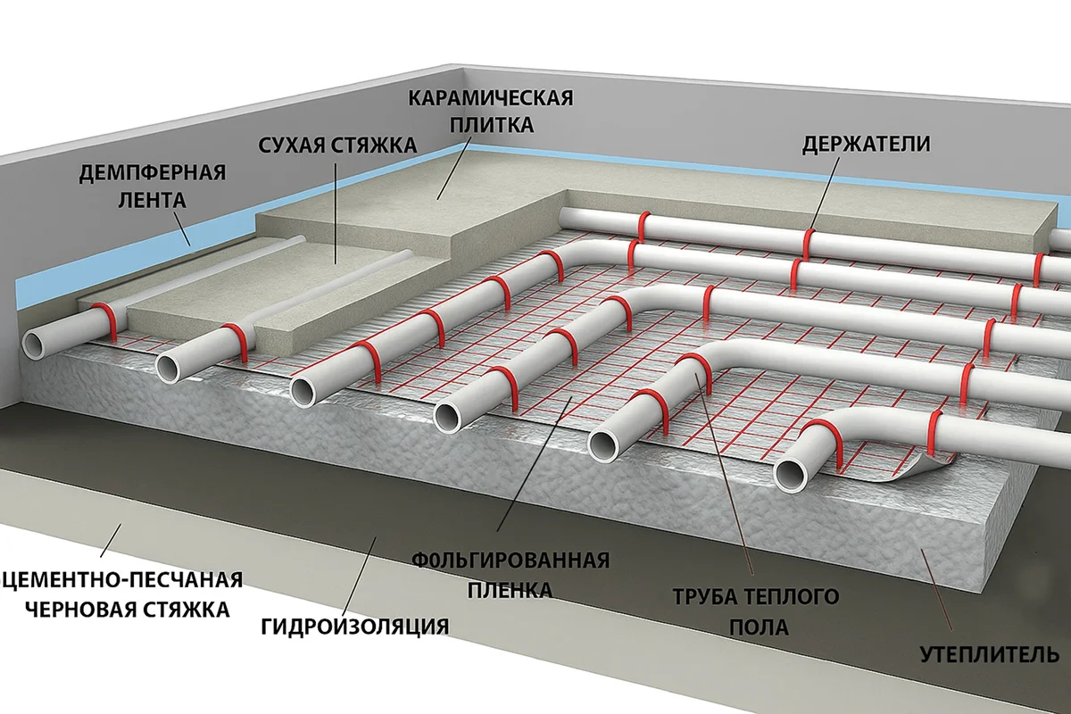 Теплый пол — это нагревательные кабели, трубы или маты, уложенные в стяжку или под напольное покрытие. Тепло поднимается снизу вверх, обеспечивая равномерный обогрев.