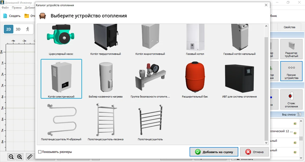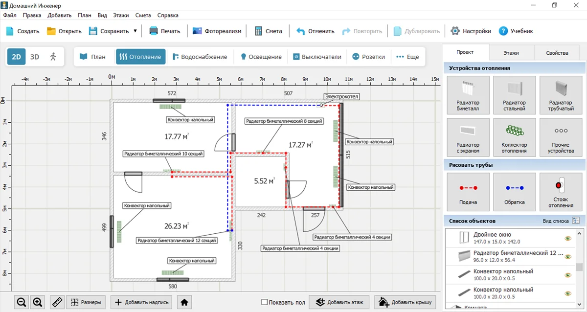 Вычисления мощности, диаметров труб и нагрузки на сеть можно провести с помощью онлайн-калькуляторов на официальном сайте Домашнего Инженера 3D. Сама программа не выполняет сложные расчеты, но зато позволяет визуализировать интерьер с учетом отопительных приборов.