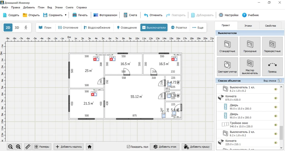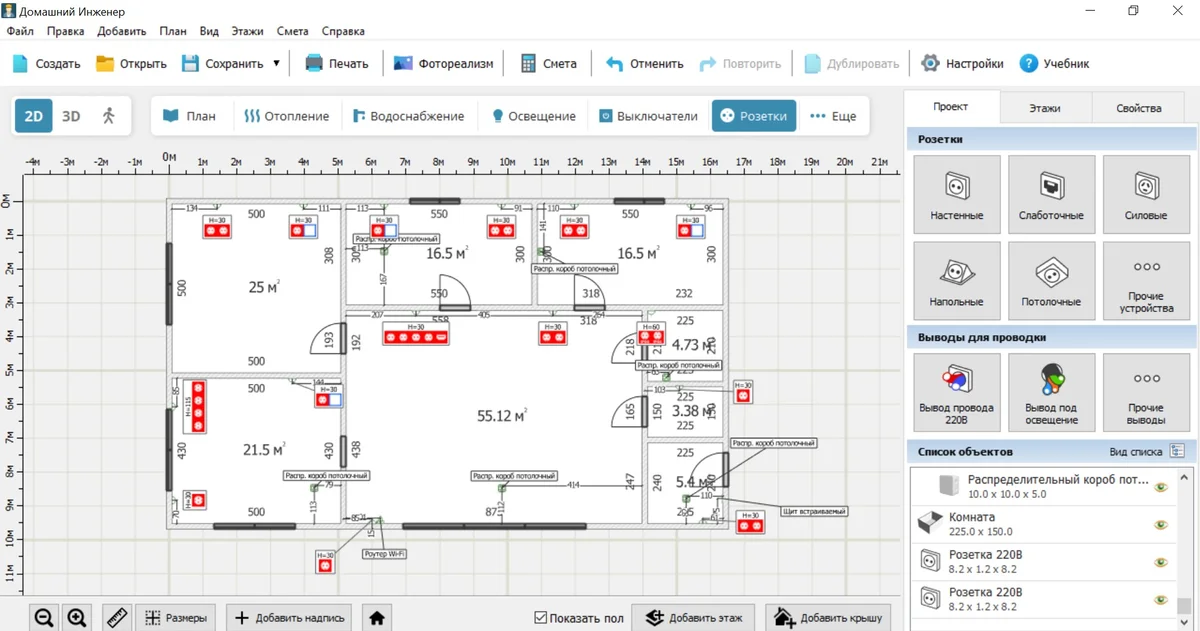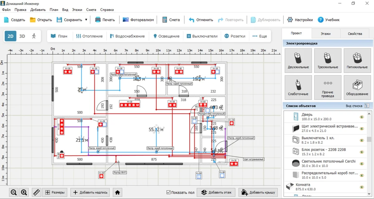 Для создания планов коммуникаций подходит программа Домашний Инженер 3D. Она позволяет спроектировать электропроводку в частном доме своими руками, не имея опыта. Интерфейс интуитивный, поддерживает работу в 2D- и 3D-режимах. Можно импортировать собственный план дома или нарисовать его с нуля.