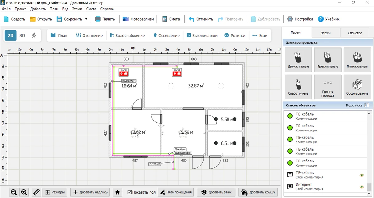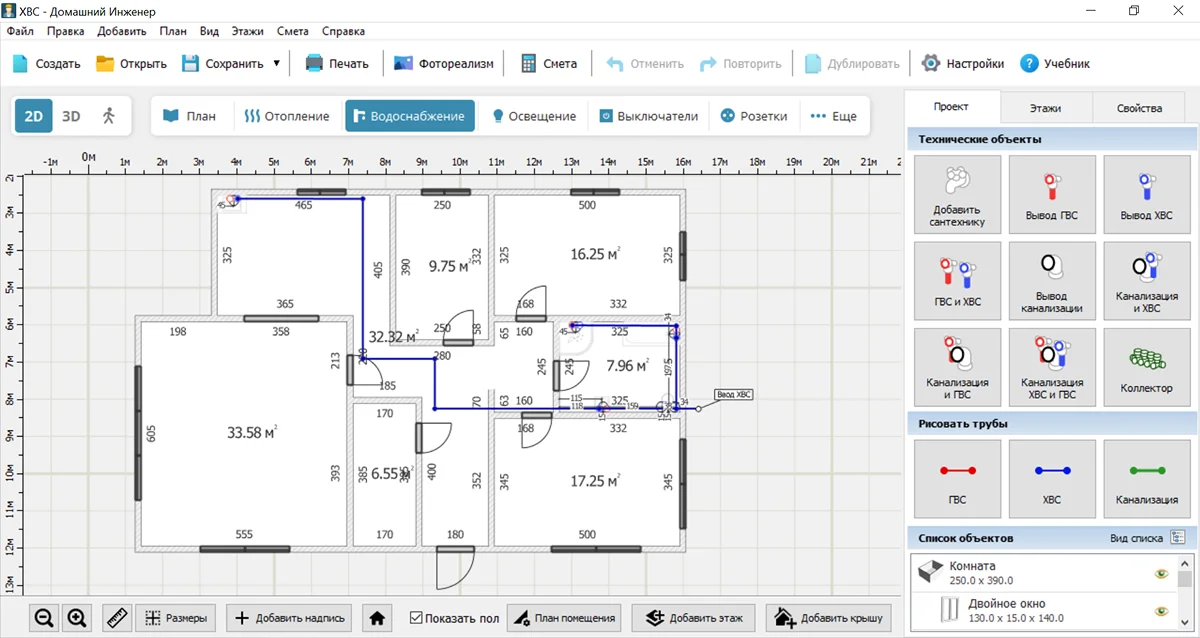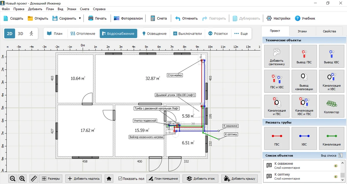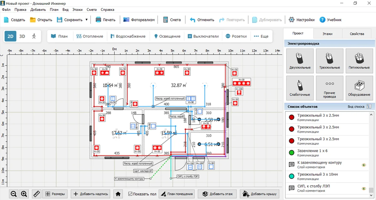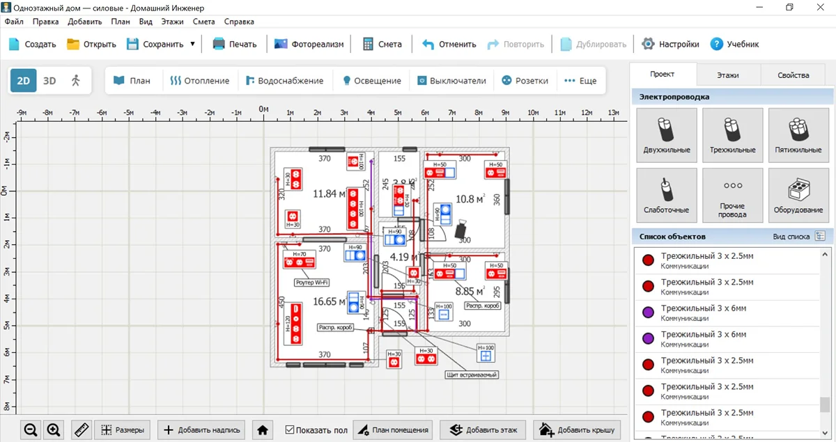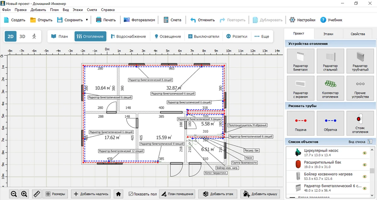 Для самостоятельной разработки подойдет программа Домашний Инженер 3D. Это ПО для комплексного проектирования коммуникаций, которое рассчитано на новичков. Приложение содержит встроенный каталог, в котором есть котлы, радиаторы, накопительные баки, электрические щиты и многое другое. Используя Домашний Инженер 3D, вы сможете: