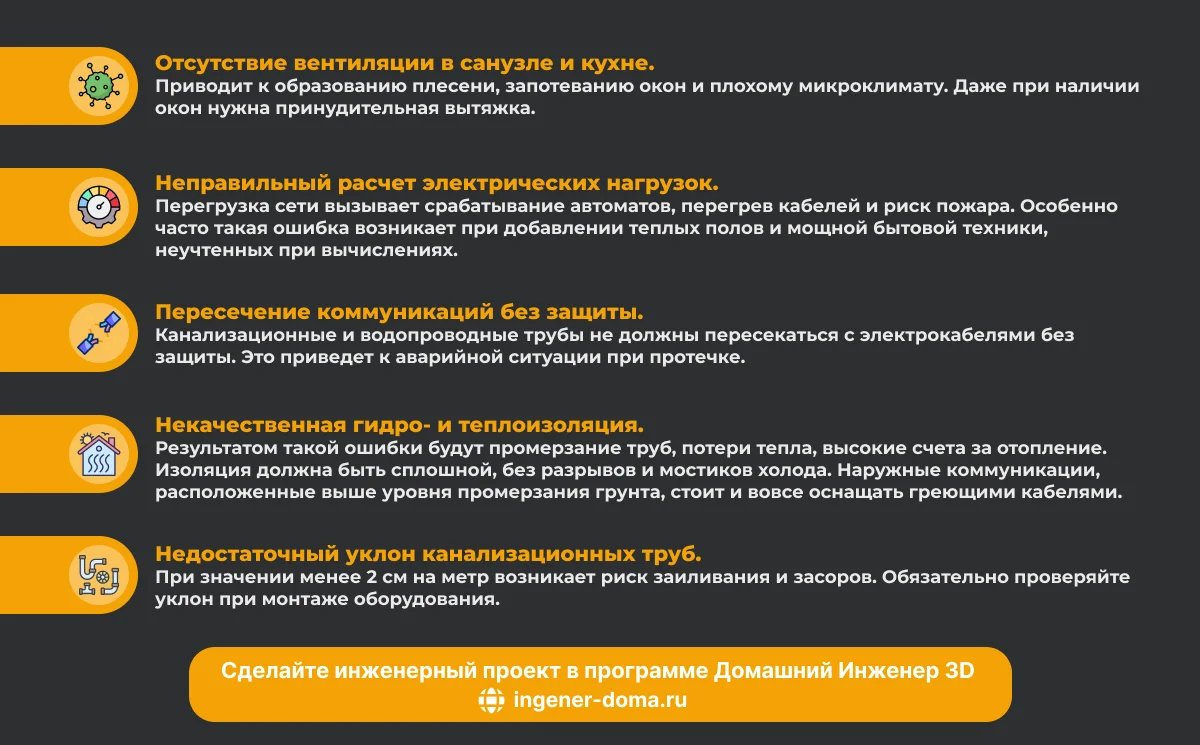 При составлении инженерного проекта дома следует изучить нормативные акты и профильную литературу. В противном случае возможны следующие ошибки: