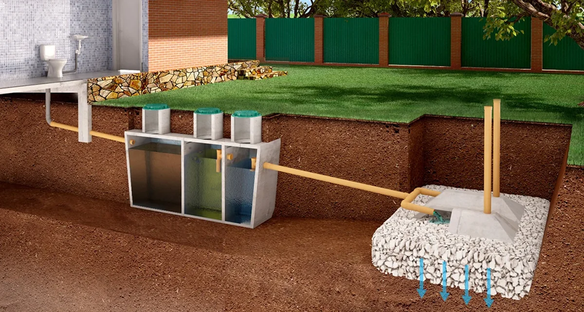 Септик работает по принципу гравитационного отстаивания и анаэробного разложения. Сточная вода проходит через 2–3 камеры, где твердые фракции оседают, а частично очищенная жидкость выводится в грунт через дренаж. Эффективность очистки – до 60%. Подходит для установки в песчаных и супесчаных почвах.