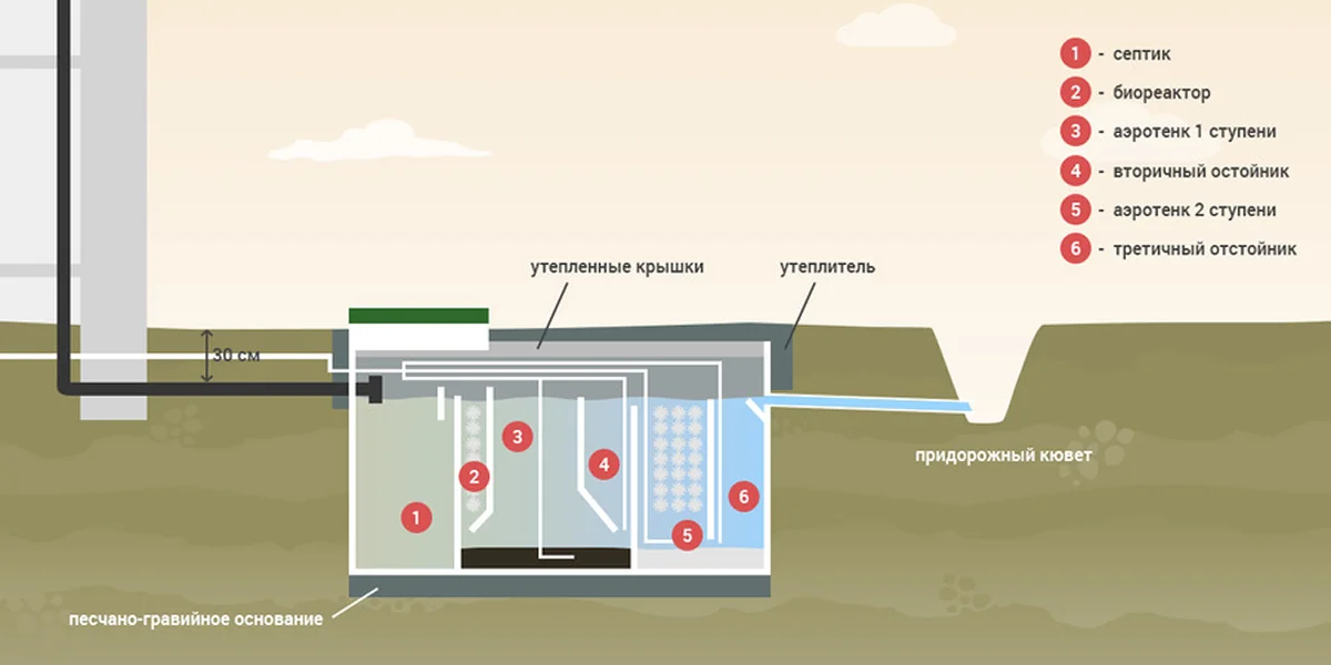 ЛОС обеспечивают глубокую биологическую очистку с использованием аэробных бактерий. Компрессор подает воздух в реакторы, где микроорганизмы разлагают органику. На выходе получается прозрачная вода без запаха, пригодная для сброса в открытый водоем, полива декоративных растений и уборки территории. Эффективность – до 98%. Главный минус – требуется стабильное электроснабжение и ежемесячное обслуживание.