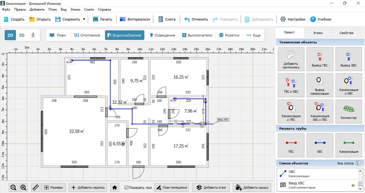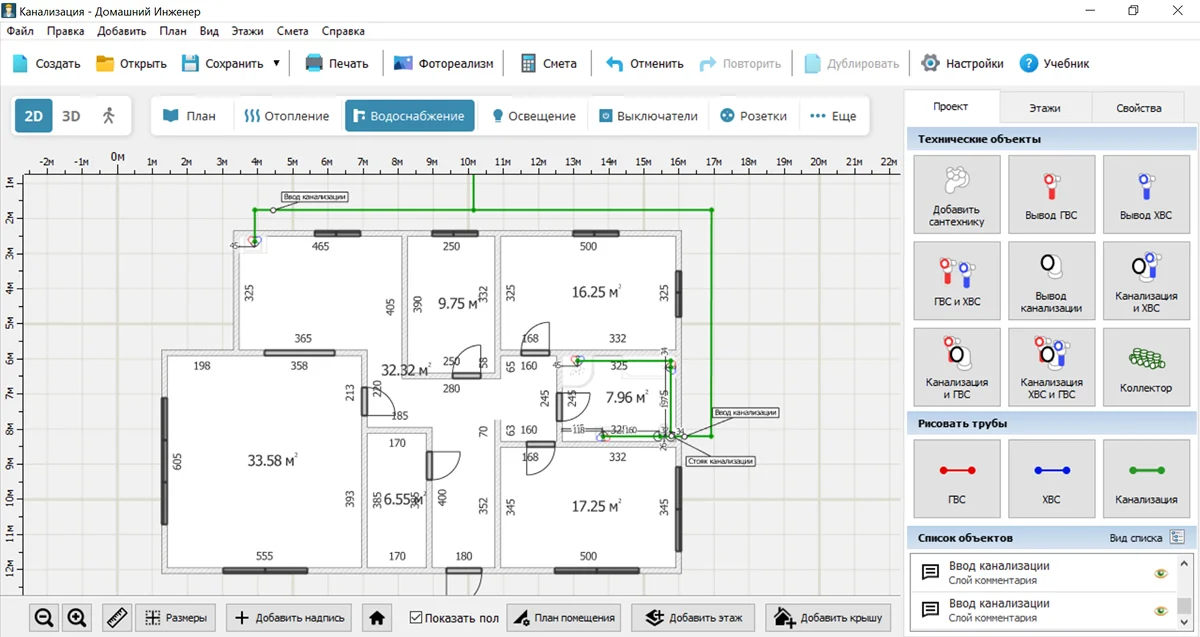 Чтобы не допустить ошибок при планировании, лучше составлять проект в специальном софте. Для этих целей подходит Домашний Инженер 3D. Здесь можно начертить планировку всего здания, добавить точки водоразбора, проложить трубы.