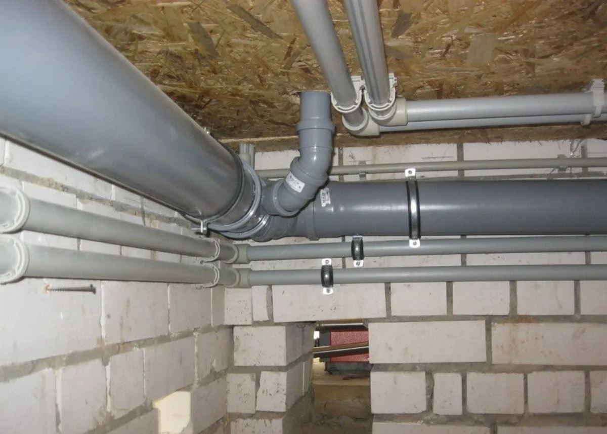 - Выполните монтаж. Соблюдайте уклон труб, герметизируйте стыки, установите ревизии и вентиляцию. При необходимости задействуйте насосы.