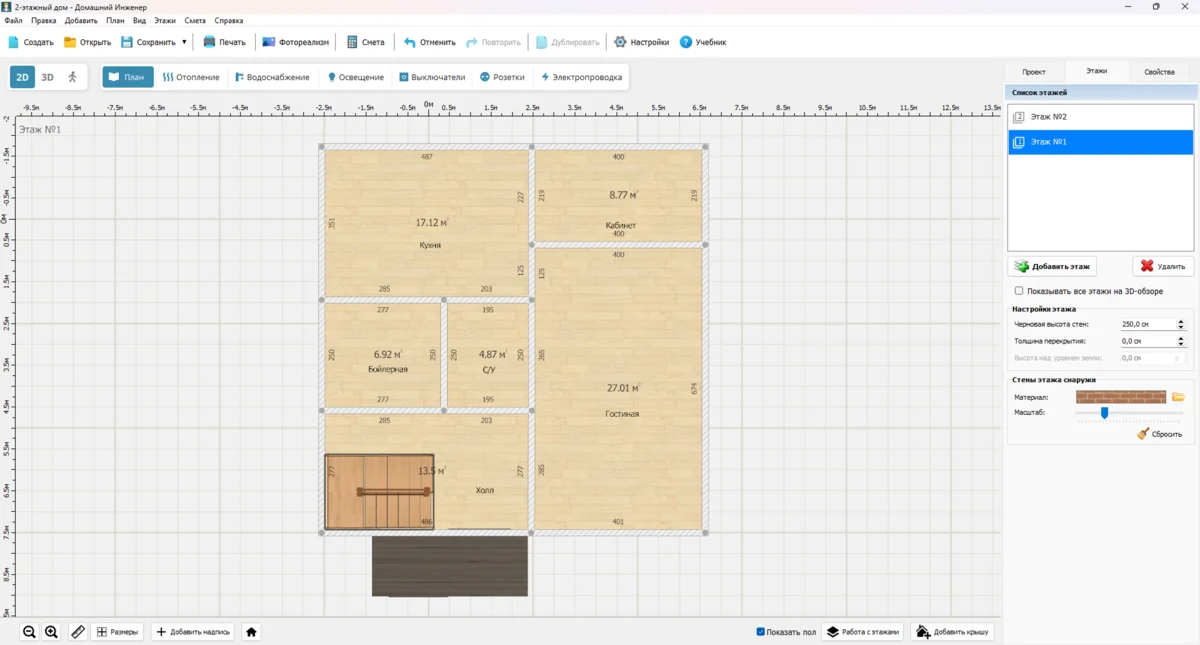 Домашний Инженер 3D — отечественная разработка. Софт позволяет сделать 3D-модель здания и наполнить помещения мебелью и декором. После этого можно нарисовать схемы коммуникаций: электрики, водоснабжения, отопления, канализации.