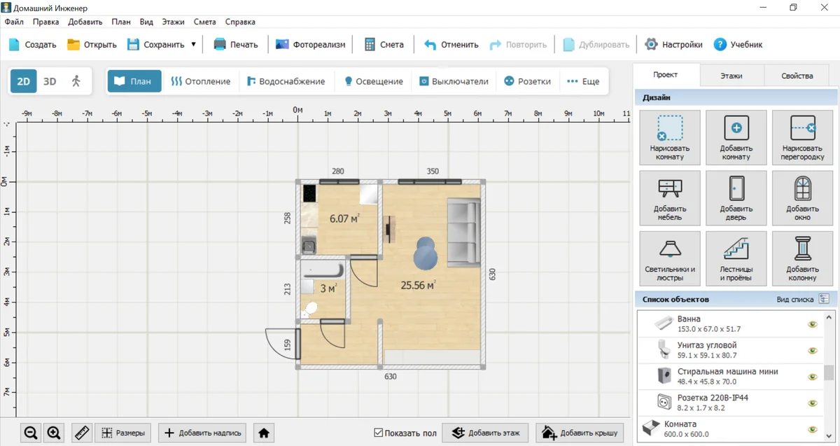 Начертить план можно где угодно, начиная от листа А4 и заканчивая сложными программами вроде AutoCAD. Но и для того, и для другого, нужен определенный навык. Если вы раньше не сталкивались с подобными задачами, лучше выбрать более простое решение. Например, составить электрическую схему в Домашнем Инженере 3D. Это интуитивно простая программа, которая подходит как новичкам, так и профессионалам. В ней есть: