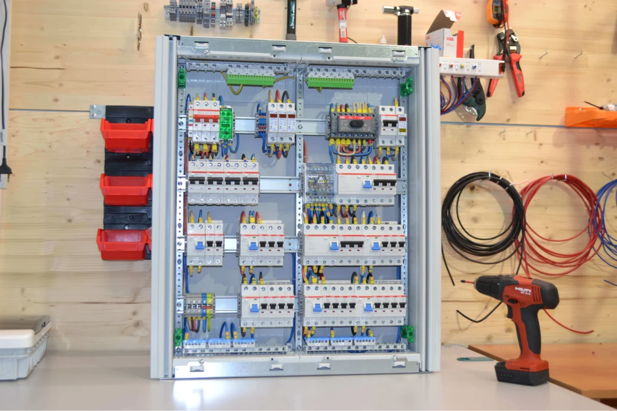 Монтаж электрощита начинайте с его надежного крепления на высоте 140-170 см от пола. Установите DIN-рейки, нулевую и заземляющую шины, после чего установите автоматические выключатели, размещая вводной автомат сверху, а групповые — ниже. Подключите провода и подпишите каждую линию на бирках, проверив надежность затяжки всех клеммных соединений.